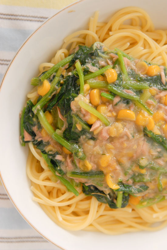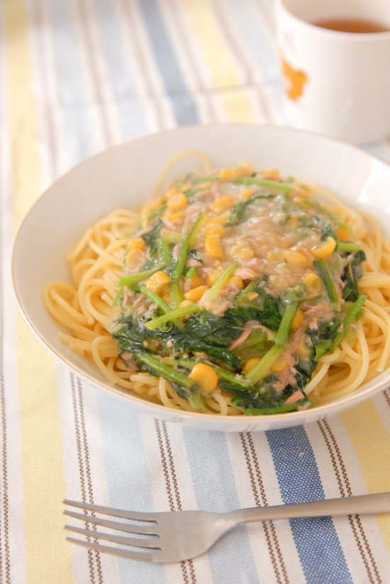 「ツナとコーンとほうれん草のスパゲティ」