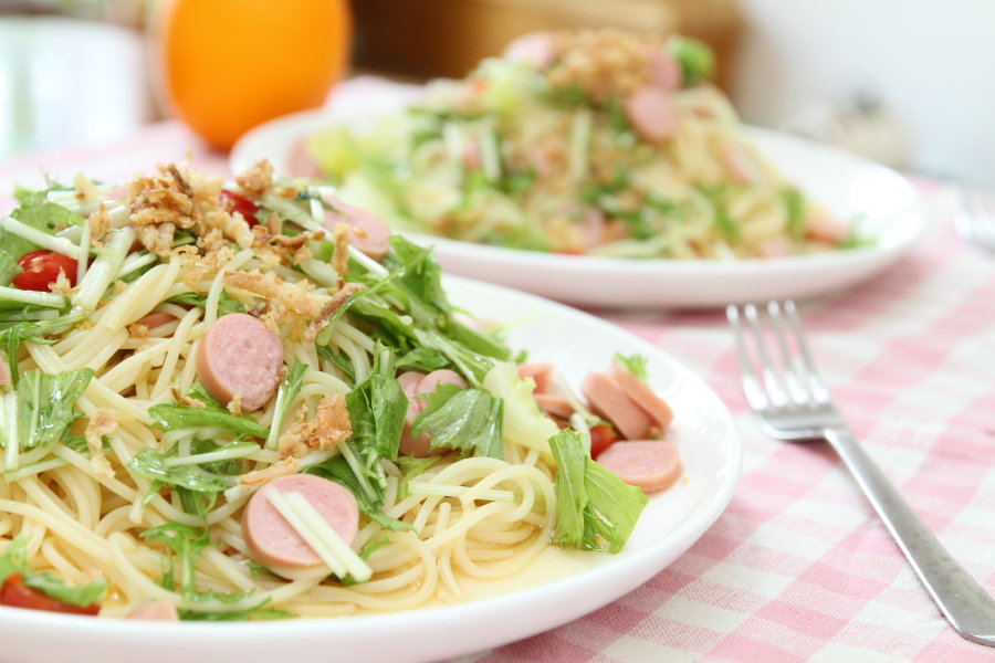 3.ゆで上がったウインナーを適当に切り、2の食材とウインナー、スパゲティをオリーブオイルで混ぜて、塩コショウで味付けしできあがり。