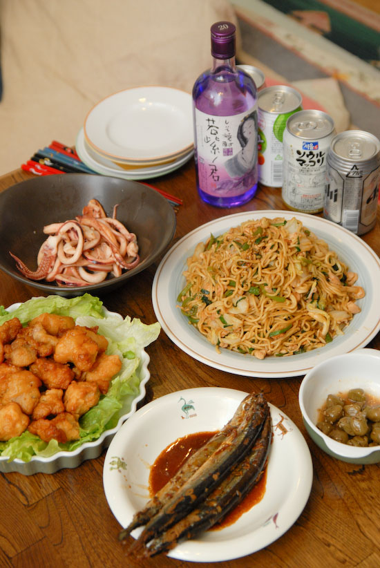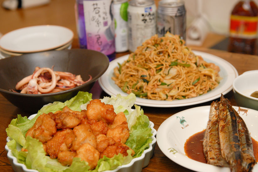 テキトウ焼きそばとイカのバター焼きを作って飲み会となりました。