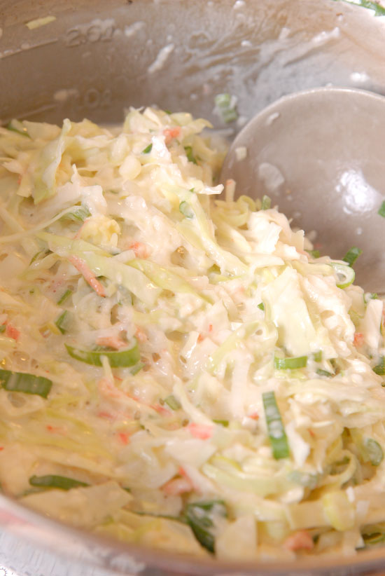 きゃべつ、コーン、長ねぎ、小えびをいれ、まぜまぜします。