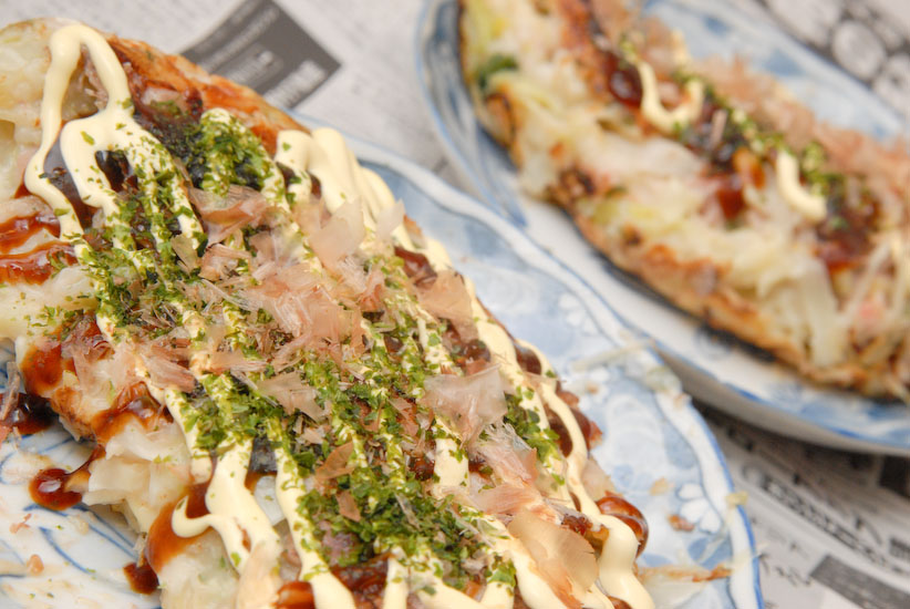 ■お好み焼きソース、マヨネーズ、あおさ、かつおぶしをかけます。