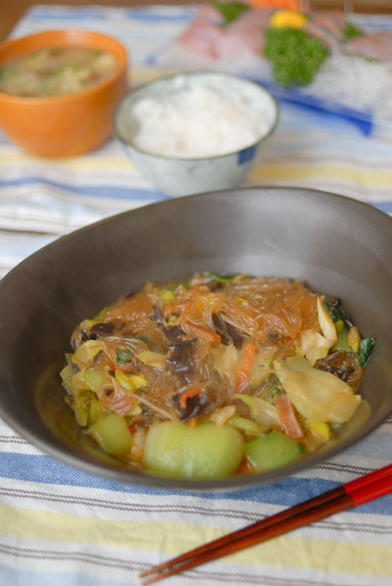 市販の麻婆春雨(まーぼーはるさめ)の素が食料庫にあったので、