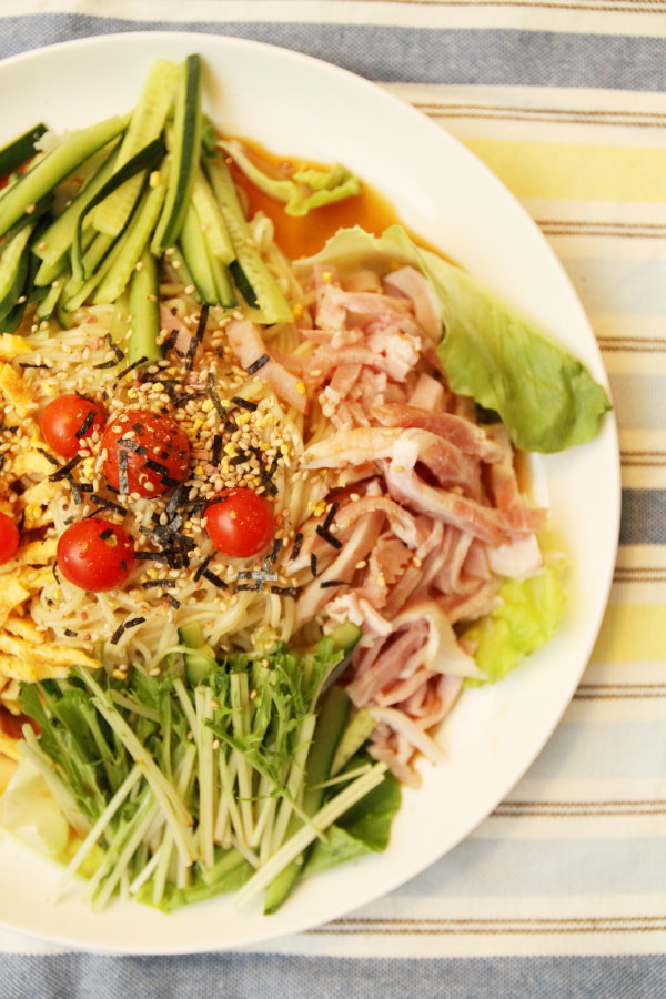 市販の冷やし中華で、材料をのせるだけの簡単メニューです。