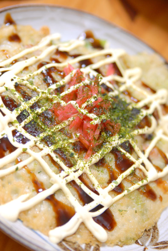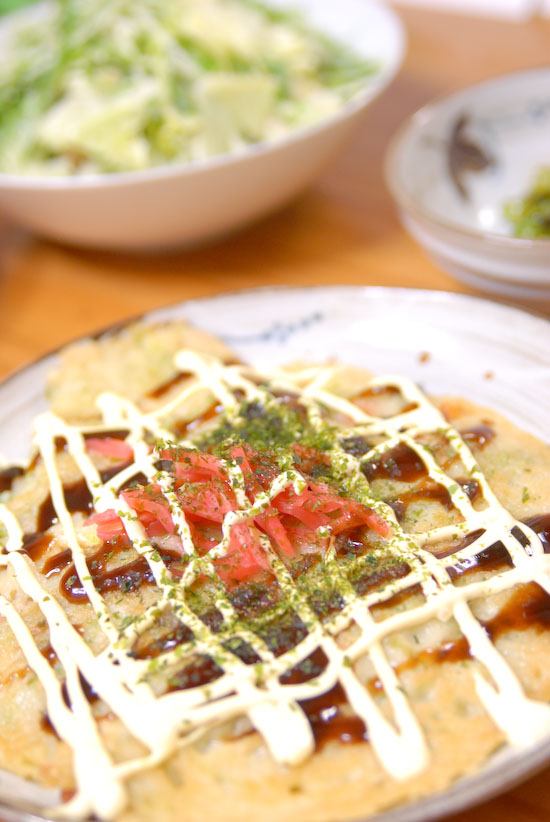 6.いい感じになったらお皿にとって、たこ焼きのソース、マヨネーズをかけ、あおさ、紅しょうがをちょんとのっけて、できあがり~。