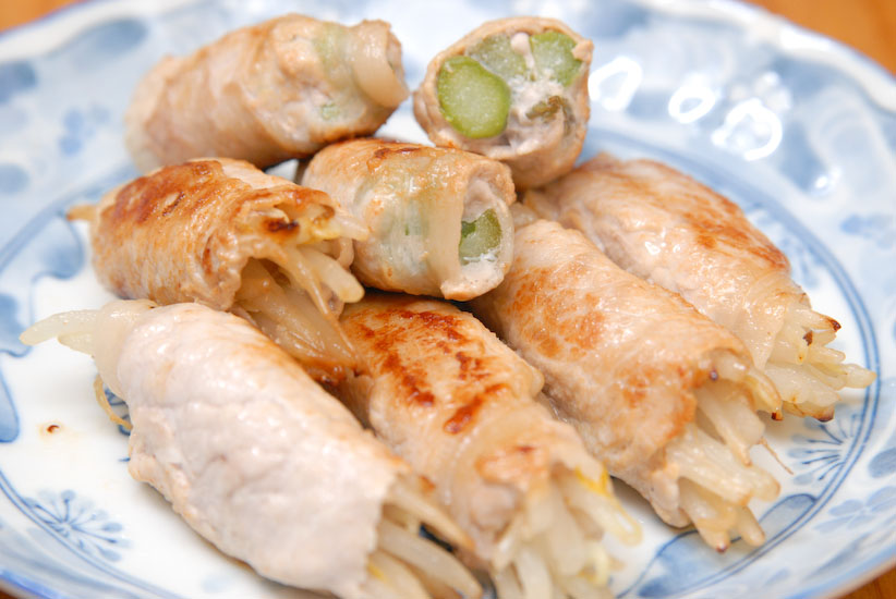 1.豚肉ロースにアスパラ、もやしを入れて巻き巻きします。